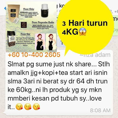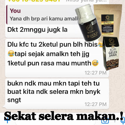 Bagi Anda yang ingin menurun berat badan, amalkan JJG yg di campur rempah + asam gelugor dalam 1 dan di campurkan dgn JJ slimme detox tea .Set ini mampu menekan nafsu makan anda sehingga anda pun terhindar dari keinginan untuk makan secara berlebihan serta mengecut kembali badan selepas bersalin.